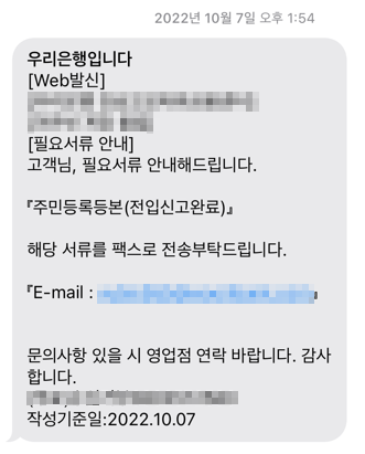 우리은행에 문의드리니까 필요한 서류를 문자로 넣어주셨고 해당 필요 서류들 준비해서 감